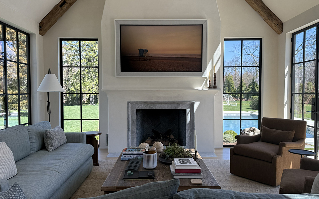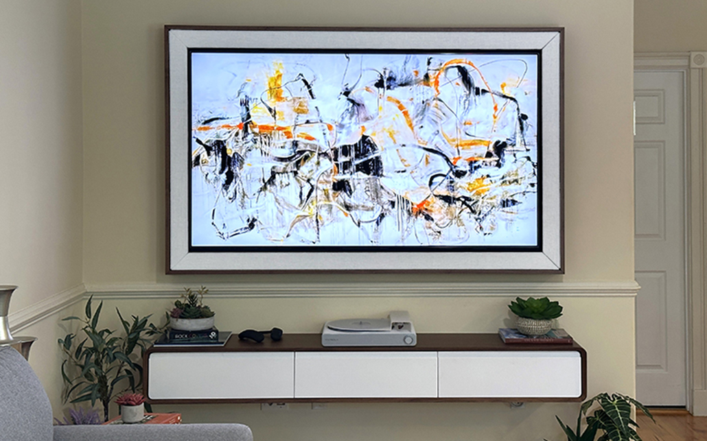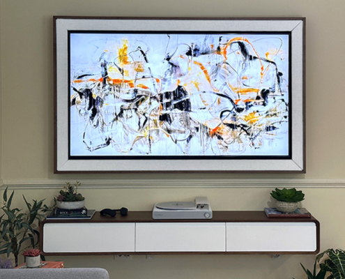*The Audio Art may be used with the Samsung Frame TV w/ special IR badge modification, or with any display that exhibits no protrusions below the tv (e.g., IR badge/sensor) that would prevent the sound modules from mounting extremely close (e.g., 1/8″) to the display.